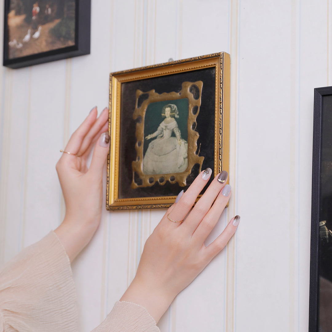 This design introduces a contemporary twist to vintage aesthetics by juxtaposing trendy brown marbling with calming cloudy gray hues.