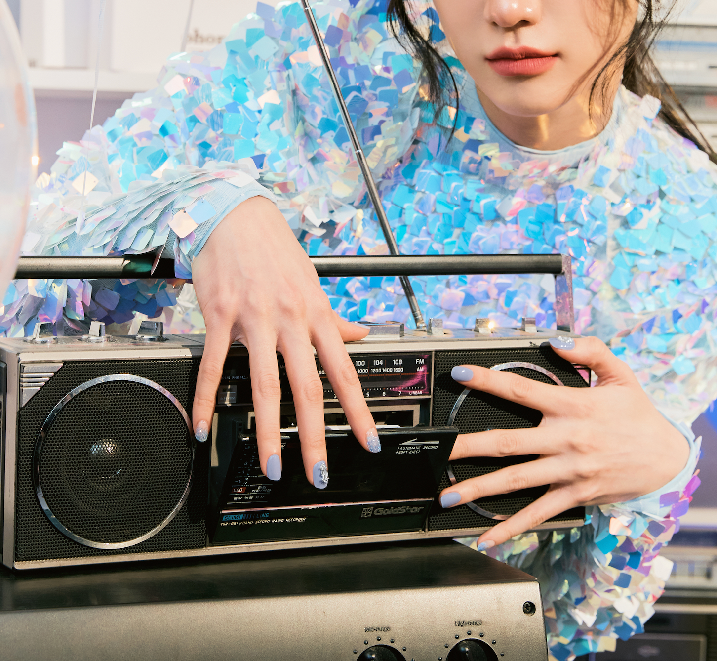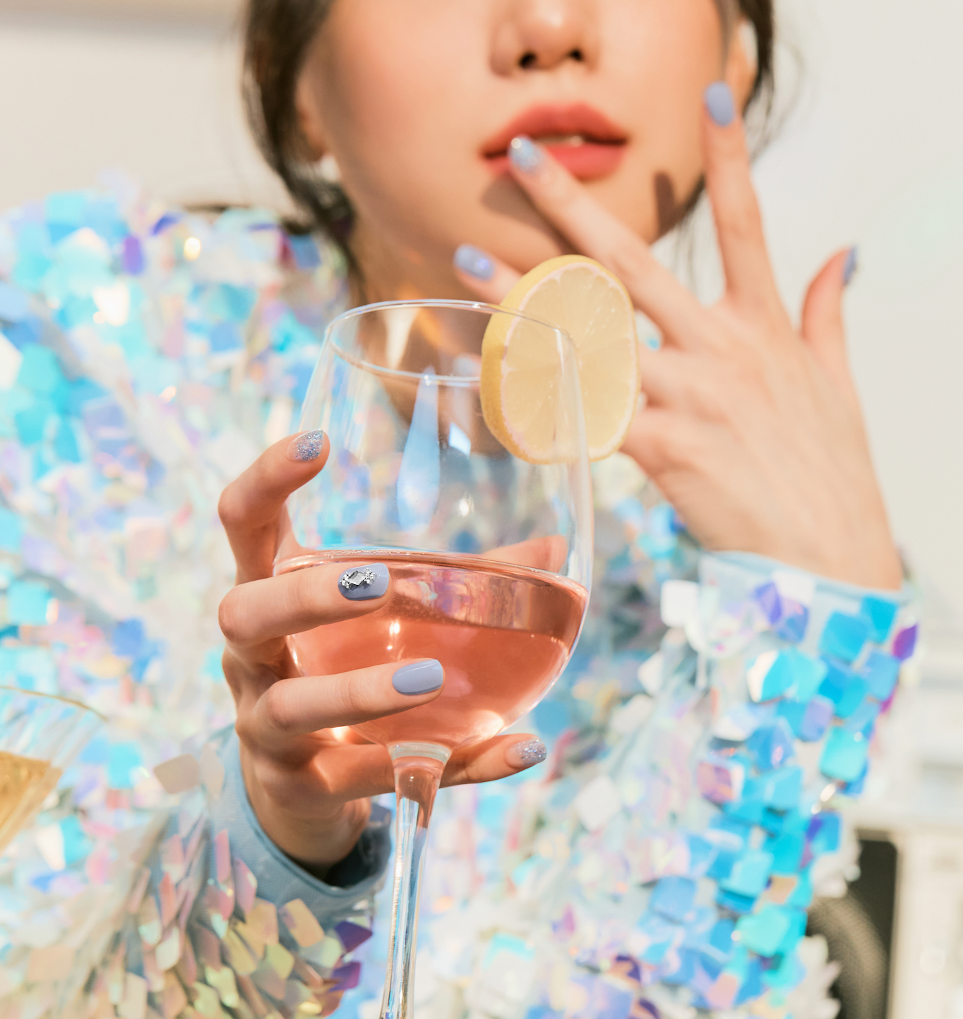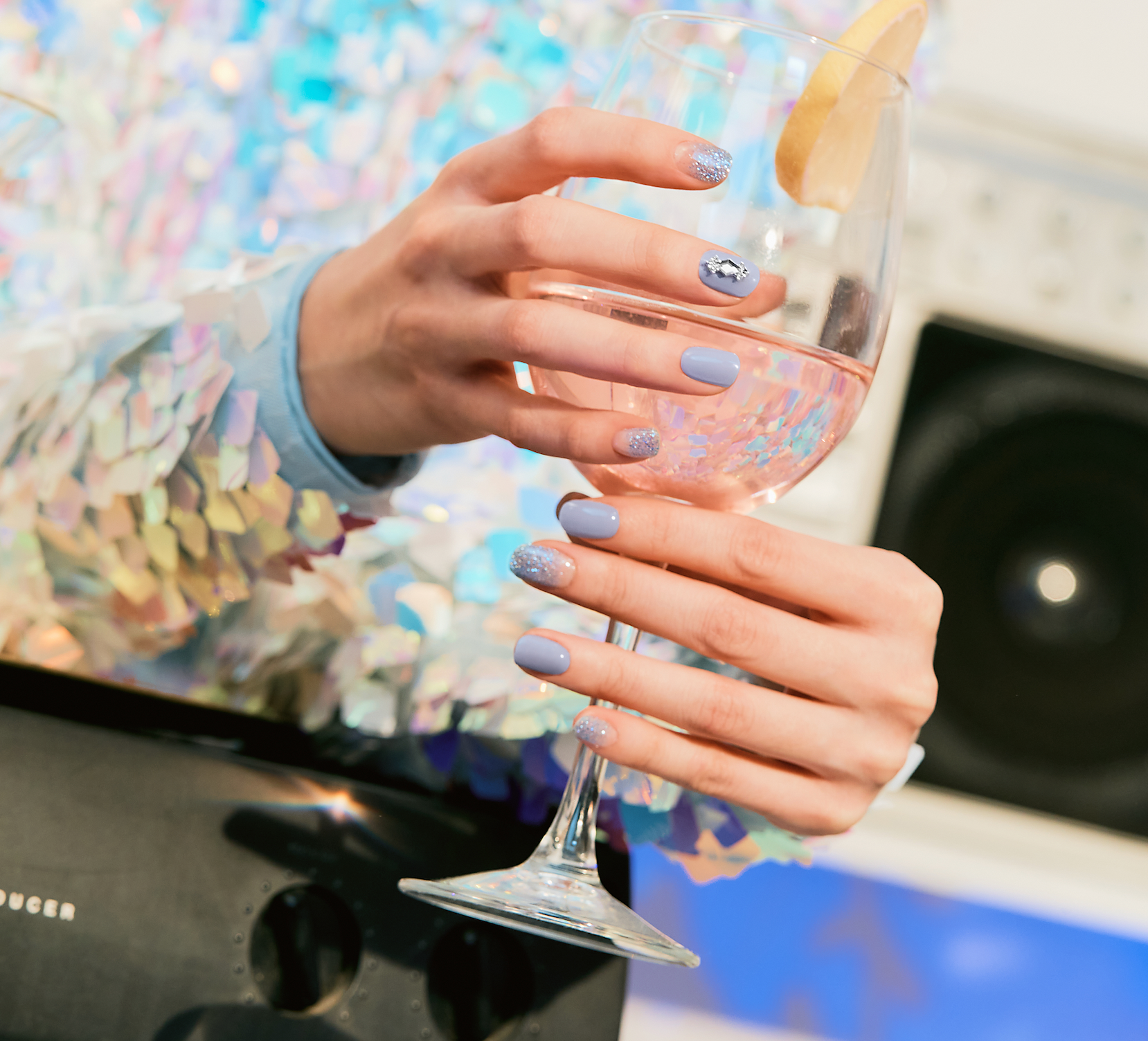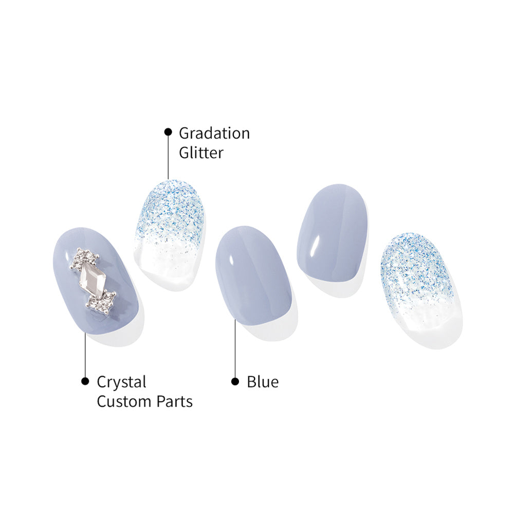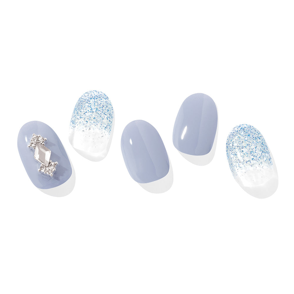 A salon-style look featuring a blend of sky blue gel with an iridescent glitter ombré and shimmering snowflake-inspired gemstones for a frosty finish.