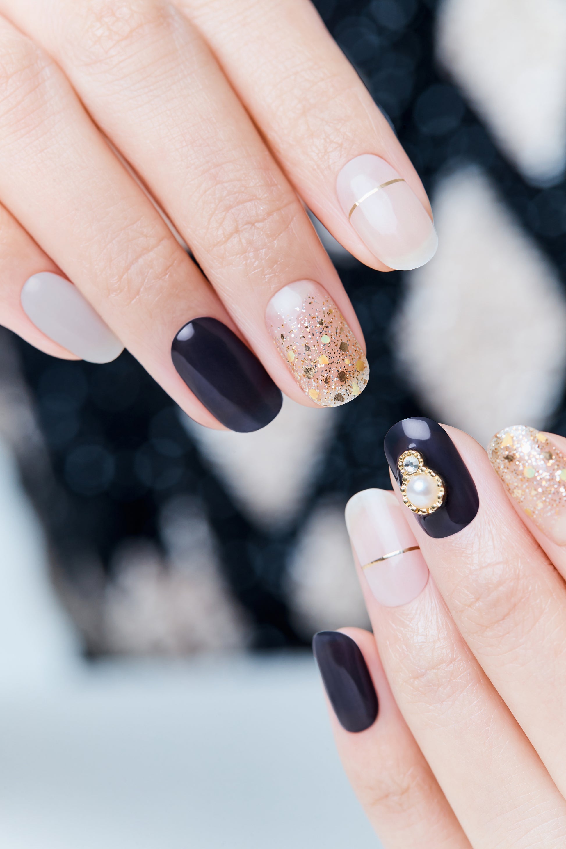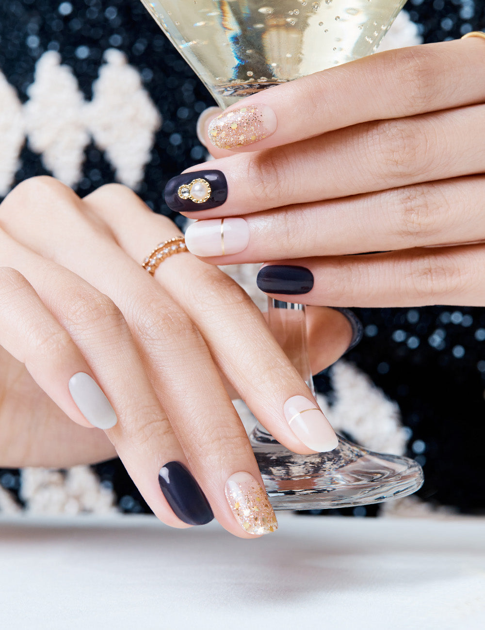 The delicate glamour of the navy blue and grey textures is complemented by the glint of gold foil lines and golden sequins, for a subtly elegant sequin manicure. Imbued with a chic atmosphere, this combination is both tasteful and sophisticated.