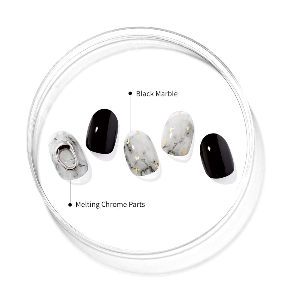 An opulent gel manicure inspired by natural marble and enhanced with a melted silver chrome piece. This inky black formula combined with marbling perfection offers a premium uplift to your nails.